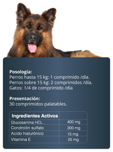 Articularvet es un potente condroprotector 100% natural, cuya fórmula combina componentes activos que participan en el tratamiento de problemas articulares como; Artritis y artrosis, siendo además un coadyuvante en procesos degenerativos y cirugías traumatológicas, ya que esta formulado para proteger las articulaciones, disminuir el dolor y devolver la facilidad de movimiento a nuestros pacientes.